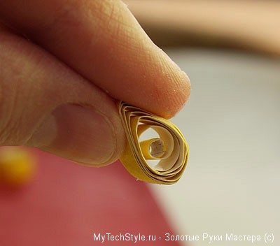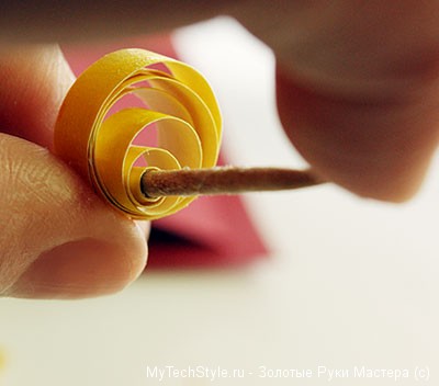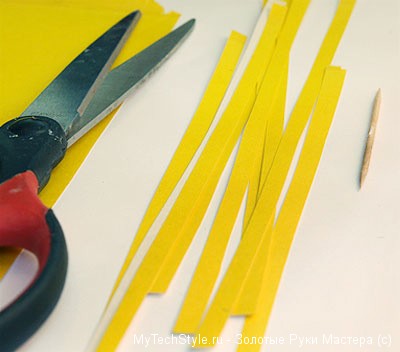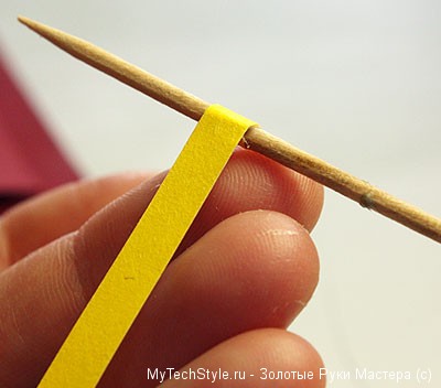 Теперь нам понадобится зубочистка или тонкая деревянная шпажка. Одну из полосок бумаги обмотайте вокруг неё, помогая пальцами: