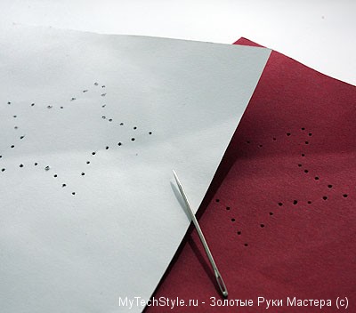 Распечатанный шаблон звезды приложите к картону и сделайте отверстия иглой на двух листах по контуру заготовки, смотрите на рисунок ниже: