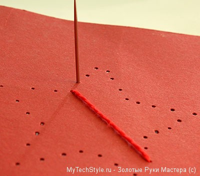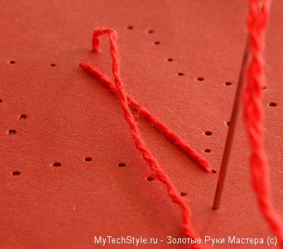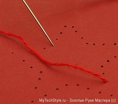 Вставьте плотную красную нить в иглу и завяжите на конце нитки прочный узел. Осторожно вытяните иголкой нить из точки №1, оставив узелок на тыльной стороне, как показано на рисунке: